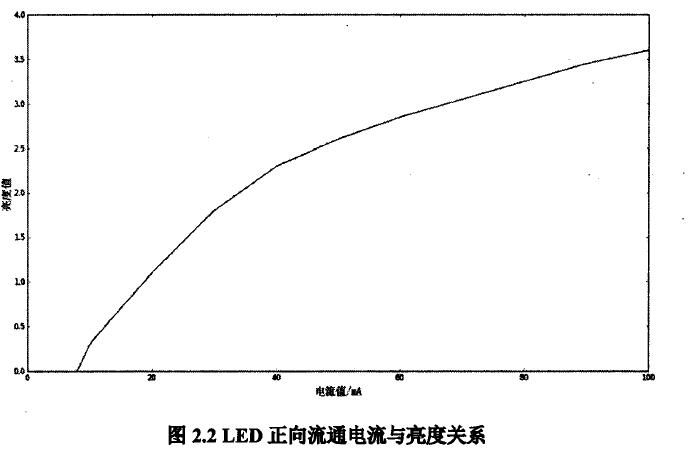 當在LED加上正向電壓之后,PN結導通,LED發光。除了某些紅色LED 有飽和現象之外,LED的亮度基本與流過其電流的大小正比,圖2.2為某廠家生 產的紅色LED電流與亮度曲線圖心10]。