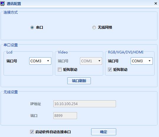 5、 點擊通訊配置,選擇先前查看到的端口號,勾選HDMI下面的矩陣聯動,確定。點擊界面上面串口通訊,點擊連接串口。可看到界面較下面COM口開啟,即表示已連接成功。