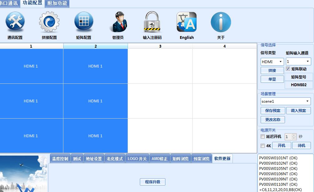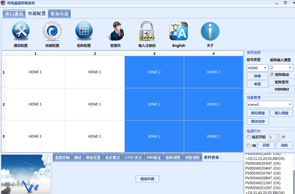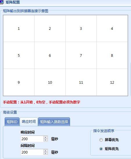 6、 點功能配置—拼接配置---選擇本屏實際3行,4列,確定。點矩陣配置,右邊HDMI矩陣選擇:HDMI02,下面矩陣ID的HDMI矩陣填00;點擊響應時間,都填上200,確定。