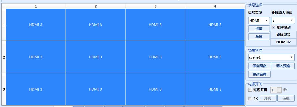 7、 整屏與分屏操作:右邊信號類型HDMI拼接勾選矩陣聯動,矩陣輸入通道,電腦接入的幾號就選幾號。如果整塊屏都顯示此通道內容,鼠標選中所有屏,使之變成藍色,點擊右邊拼接即可。如果只在一部分顯示就選中一部分點拼接,另一部分沒選的如果沒改變通道就會留下先前的部分內容。另一部分想留藍色鼠標選中后可選沒接路信號的通道,想黑屏鼠標選中后可點擊右側的“待機”,關掉電源。想打開鼠標選中后點“開機”,幾秒后電源打開。