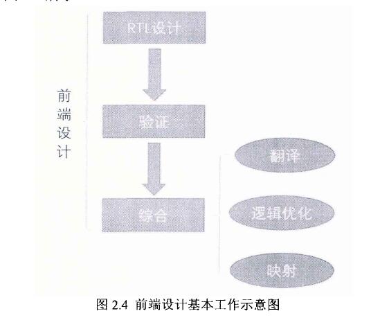 前端設(shè)計(front-end) 一般是指芯片從RTL設(shè)計到生成可以布局布線的門級網(wǎng)表(Netist) 的階段,按照工作內(nèi)容進行劃分,主要包括設(shè)計、驗證和綜合三大部分,如圖2.4所示。