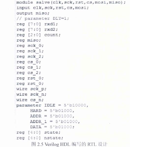 數(shù)字前端設(shè)計需要借助特定的EDA工具。早期的硬件IC系統(tǒng)通常采用原理圖輸入的方法進行設(shè)計,雖然這種方法直觀、可控性好,并且效率也較高,但設(shè)計復雜,可移植性差,在大規(guī)模設(shè)計時耗時耗力。隨著芯片邏輯規(guī)模的不斷攀升和計算機技術(shù)的發(fā)展,這種落后的設(shè)計方式越來越顯得力不從心,取而代之的是計算機代碼輸入的方式,即硬件描述語言HDL (Hardware Description Language)逐漸成為主流設(shè)計硬件IC系統(tǒng)的方法。 本文RTL設(shè)計采用的就是Verilog HDL語言,如圖2.5所示,為SPI接口協(xié)議的部分Verilog 硬件描述語言。