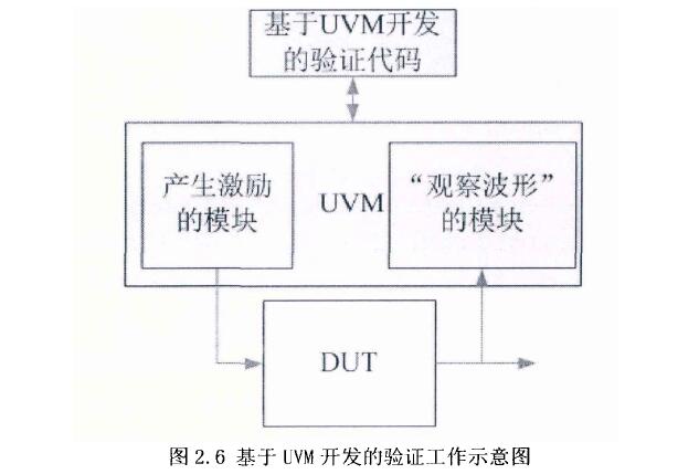 目前芯片的驗證環(huán)境主要為UVM,全稱為通用驗證方法論,其前身是OVM.UVM是通用的驗證平臺,基于它能夠產(chǎn)生大量、復雜且可定制化的隨機激勵,可顯著提高大型驗證工程的擴展性和協(xié)作性。舉例說明,UVM框架如軟件開發(fā)過程中的分層結(jié)構(gòu),只要定義好統(tǒng)一的接口,工程中的各個層次就可以分配給不同的研發(fā)團隊進行開發(fā)。驗證的項目同樣如此,即使產(chǎn)生激勵的工程有改動,也不會影響到“觀察波形”的團隊。而UVM在驗證工作中如同一個管家,可以將“輸入激勵”和“觀察波形”的過程統(tǒng)一管理了起來。如圖2.6所示,為基于UVM開發(fā)的驗證示意圖,其中DUT為待驗證模塊,產(chǎn)生激勵模塊即編寫的TestBench。 激勵信號傳入DUT中,輸出需要觀察的波形或者結(jié)果,通過與預期的結(jié)果比較的過程,來判斷編寫的RTL代碼是否正確。