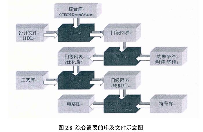 綜合一般由三部分組成, 分別是翻譯(Translate). 邏輯優(yōu)化(Optimizing)和映射(mapping)。 如圖2.7所示,為綜合過程的示意圖。如圖2.8所示,為綜合需要用到的庫及文件。