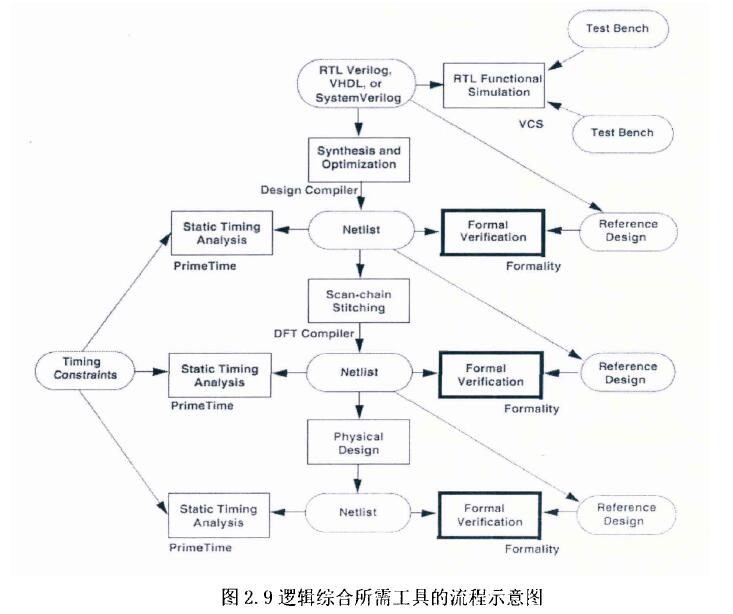 為此,綜合過程需要多種工具來保障對時序的要求。比如可測試性設(shè)計(DFT)、形式驗證(Formal Verification)、靜態(tài)時序分析( Static Timing Analysis,STA)、功能仿真( Functional Simulation)等。如圖2.9所示,為綜合所需工具的流程示意圖。